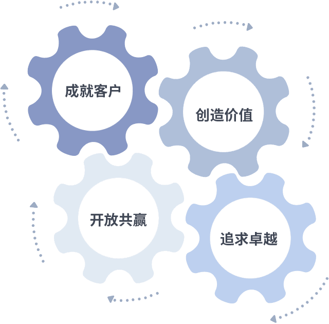 成就客户是一切决策的出发点,,,创造价值是衡量所有工作的标准,,,,追求卓越是我们做事做人的态度,,,,开放共赢是我们的格局也是最终的结果。。。价值观的齿轮环环相扣,,,,推动着组织里的每个人不断向前。。。。